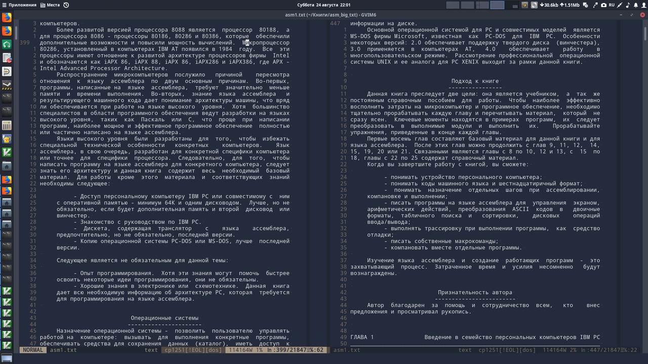 Вертикально на монитор текста вмещается мало, в читалках есть возможность отображать две страницы рядом, так пустое пространство справа всегда занято, есть ли такой режим в vim без плагинов? А в Emacs? Если нет, то можно ли как то с помощью Xorg отобразить высокое окно в виде широкого разбитого?