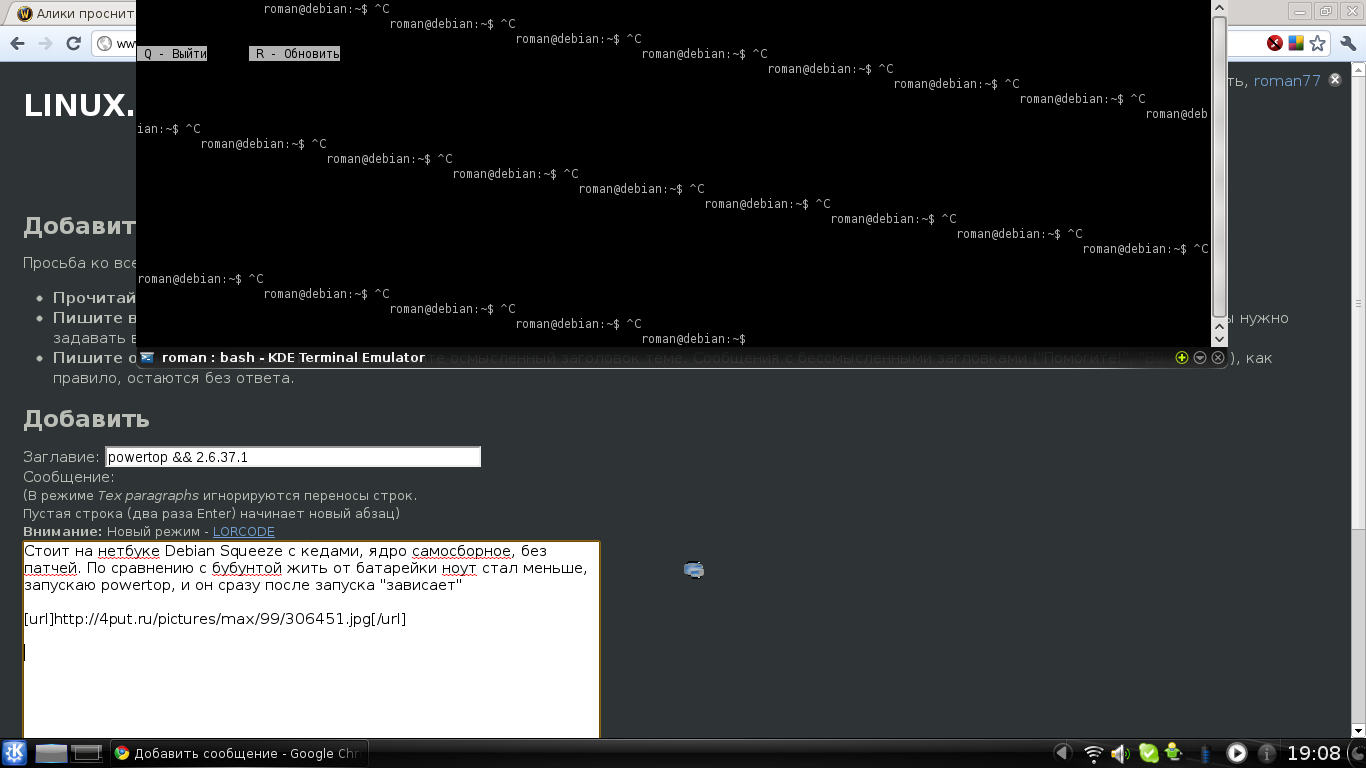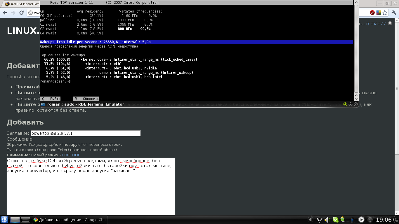 Стоит на нетбуке Debian Squeeze с кедами, ядро самосборное, без патчей. Запускаю powertop, и он сразу после запуска «зависает»