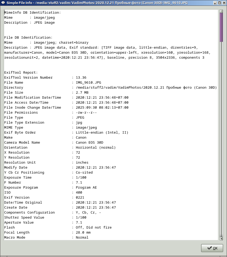 Программа отображает диалоговое окно с различной информацией о файле, получаемой из инструментов mimetype, file, exiftool, mediainfo, gio info.