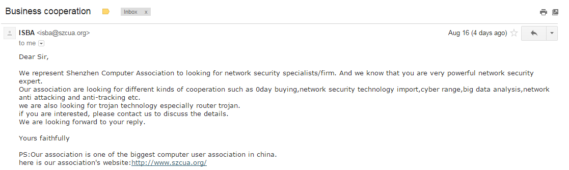 Некто Роберт Невский, называющий себя торговым представителем ShenZhen Computer Users Association в России (официальный сайт http://www.szcua.org), обратился к специалистам нескольких российских ИБ-компаний с предложением купить у них эксплойты, использующие уязвимости нулевого дня (0day, уязвимости, о наличии которых еще не знает компания--разработчик софта), под различное программное обеспечение.