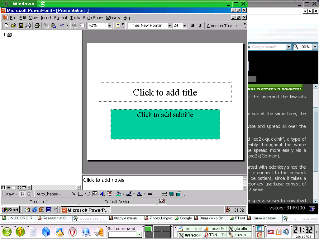 На переднем плане Win4Lin 5.0 причём в win4lin-е проинсталлирован MustDie98 и довольно сносно в нём работает Офис и еМуле, позади win4lin-а Opera 7.20, а на заднем фоне консоль, KMail, Kate с 7-ю файлами в кэше. Как видно из скриншота - все приложения существуют не конфликтуя, хотя на месте Офиса должен был быть открыт OpenOffice :))