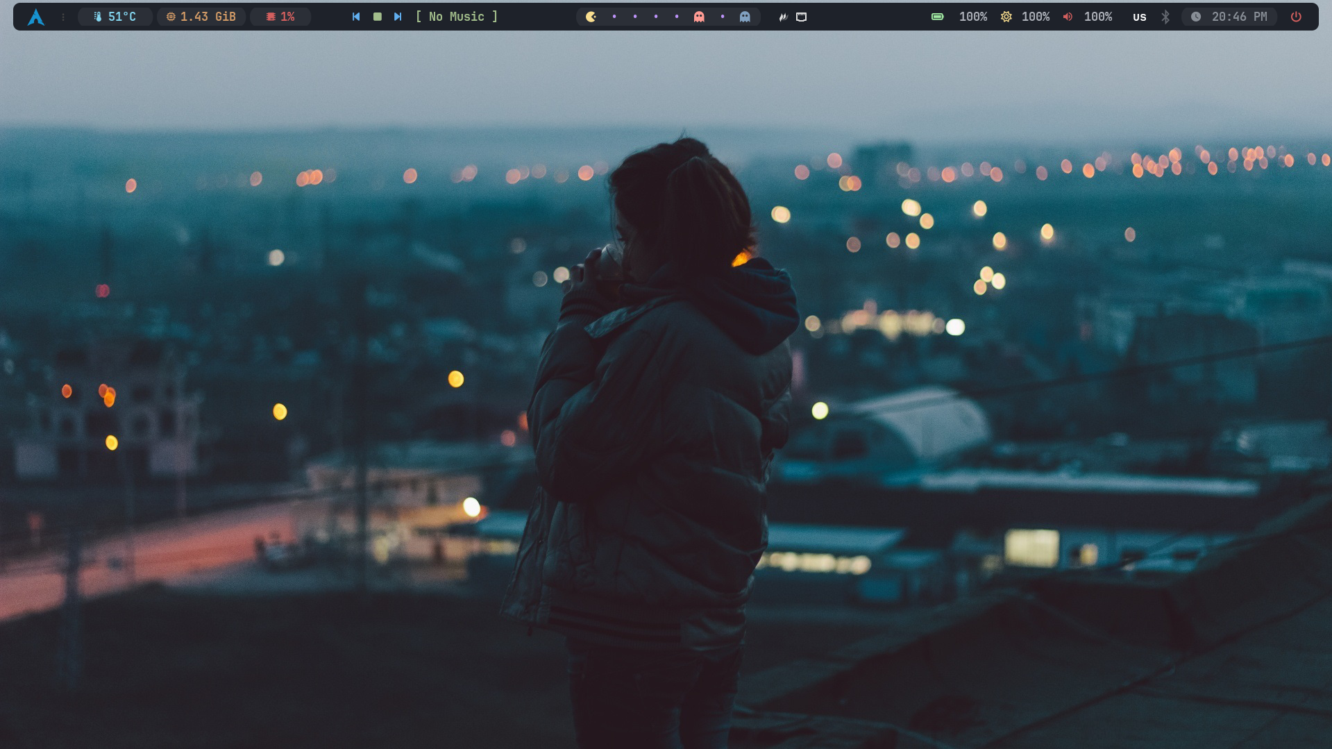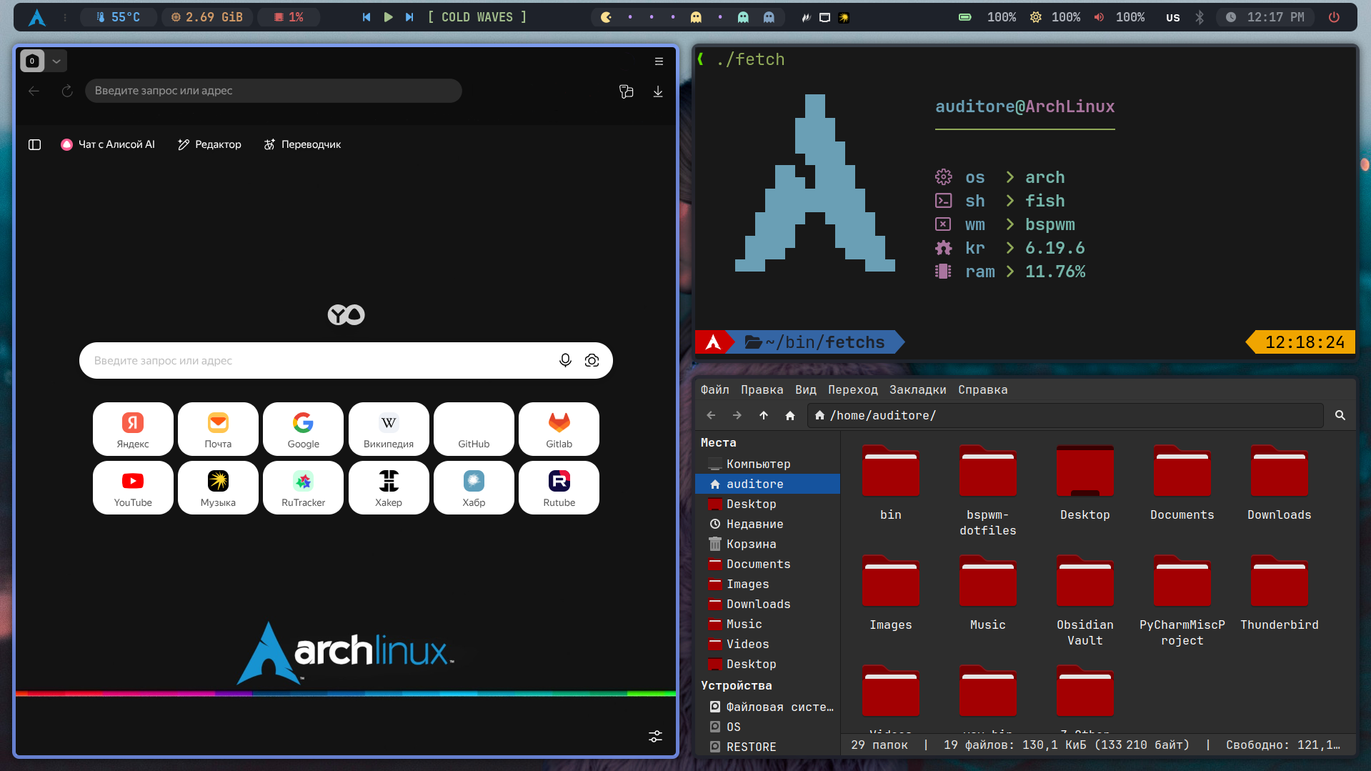 Сам рабочий стол с минимумом расширений: Blur my Shell, Dash to Dock, Language Switch Button, Night Theme Switcher, No overview at startup.