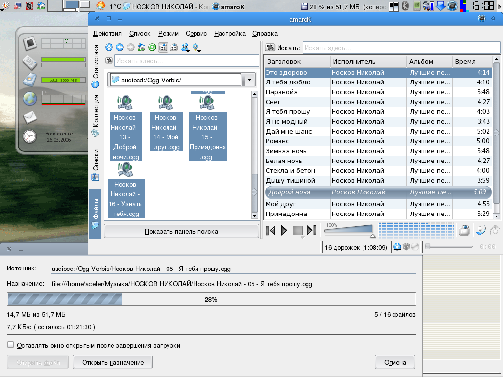 Пришлось немного повозиться с CDDB, чтобы русские буквы увидеть. KDE 3.5.0 тема Tiblit, прогресс-бары анимированные (на скриншоте, понятно, не видно). Апплет на фоне - Superkaramba.