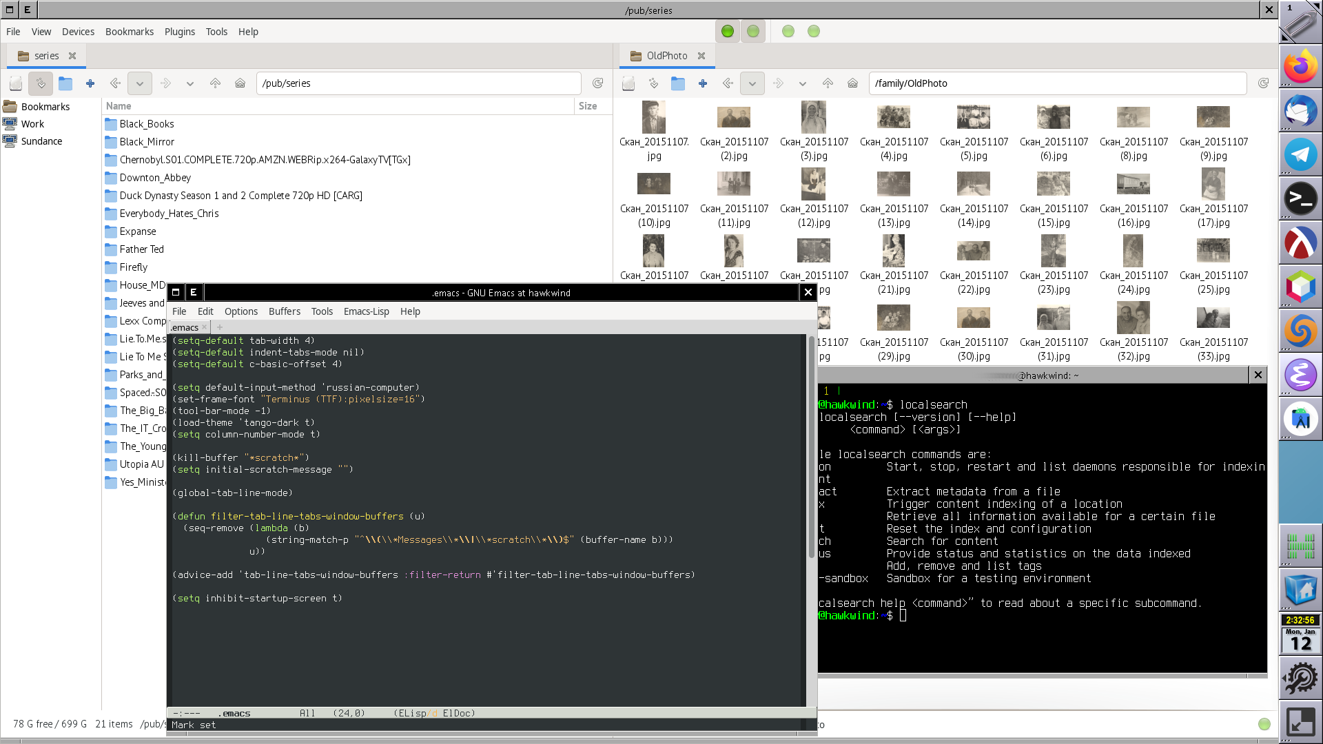 Файловый менеджер spacefm. Привык к нему в прошлых версиях Дебиана, когда остальные файловые менеджеры, будучи зависимы от udev, зависели через него и от systemd. Сейчас это уже не так, но spacefm быстрый и настраиваемый, хотя и немного упоротый и часто вылетает. Непонятная ошибка с тем, что команда «открыть директорию» открывает поиск в этой директории, лечится добавлением следующей команды в /etc/X11/Xsession.d: