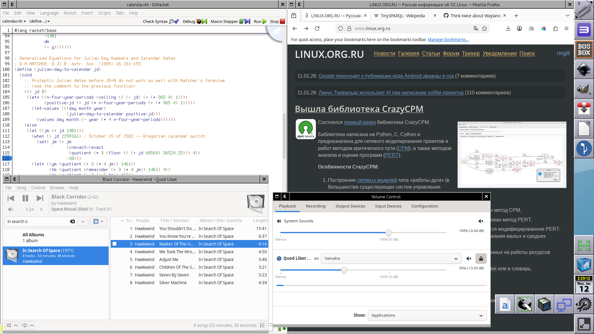 WindowMaker с ручной доработкой, в основном сводящейся к скачиванию иконок приложений из интернета. В правом-нижнем углу обычный WMDock, но с иконкой «свернуть все окна» и с настройкой, что клик по ней вызывает команду xdotool key super+d (а в настройках wmaker это сочетание клавиш сворачивает все окна). Над этой иконкой wmdrawer, ещё выше wmcalclock, остальное приложения.