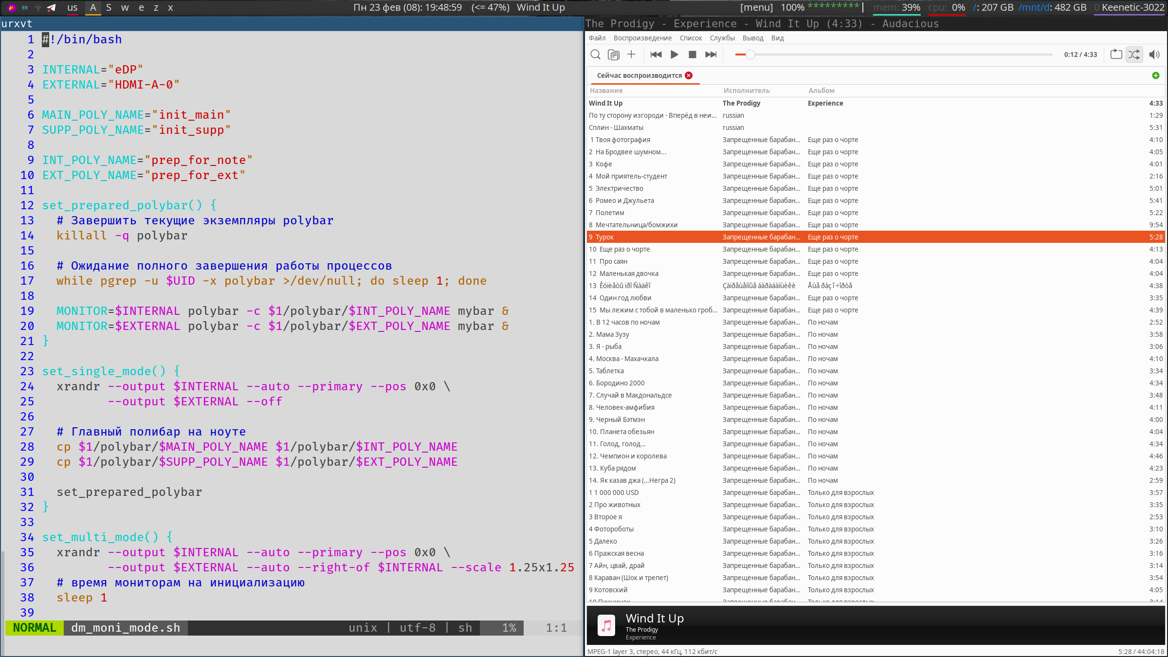 - Есть ноут, который может использоваться отдельно, а может совместно с внешним монитором. - Учтены три варианта вывода: - single — вывод только на экран ноута - multi — вывод и на ноут и на внешний монитор - ext — вывод только на внешний монитор - Для всех вариантов вывода написана конфига polybar — есть основная панель и дополнительная (только воркспейсы), в multi — на внешнем мониторе основная, в остальных режимах — основная на работающем выводе. - Использую 15 рабочих столов, к части из них приписаны некоторые приложения. В случае multi-режима часть столов мигрирует на дополнительный вывод. Ну и в процессе работы можно перемещать воркспейсы между выводами при необходимости.Старт полибара похоже происходит с какой-то гонкой, иногда запускаются лишние полибары, забил на это — случается редко и исправляется перезагрузкой i3 по хоткею.