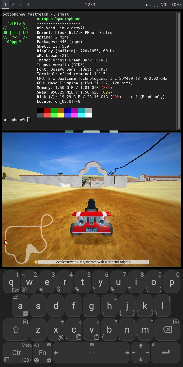 …делать было решительно нечего. Встречайте - termux+proot-distro+void+termux-x11+bspwm+xcompmgr+тотальная скука. Игра не играется, клавиши не читает, запустил чтоб добить уровень маразма. Обои из void-artwork. Думал через fex-emu запустить какую-нибудь старую игрушку, но stk показал мне, что эта фигня через эмулятор даже первых принцов персии не потянет. Собственно больше говорить нечего. Тут ещё rofi есть, но мне за мой конфиг стыдно, так что показывать не буду.