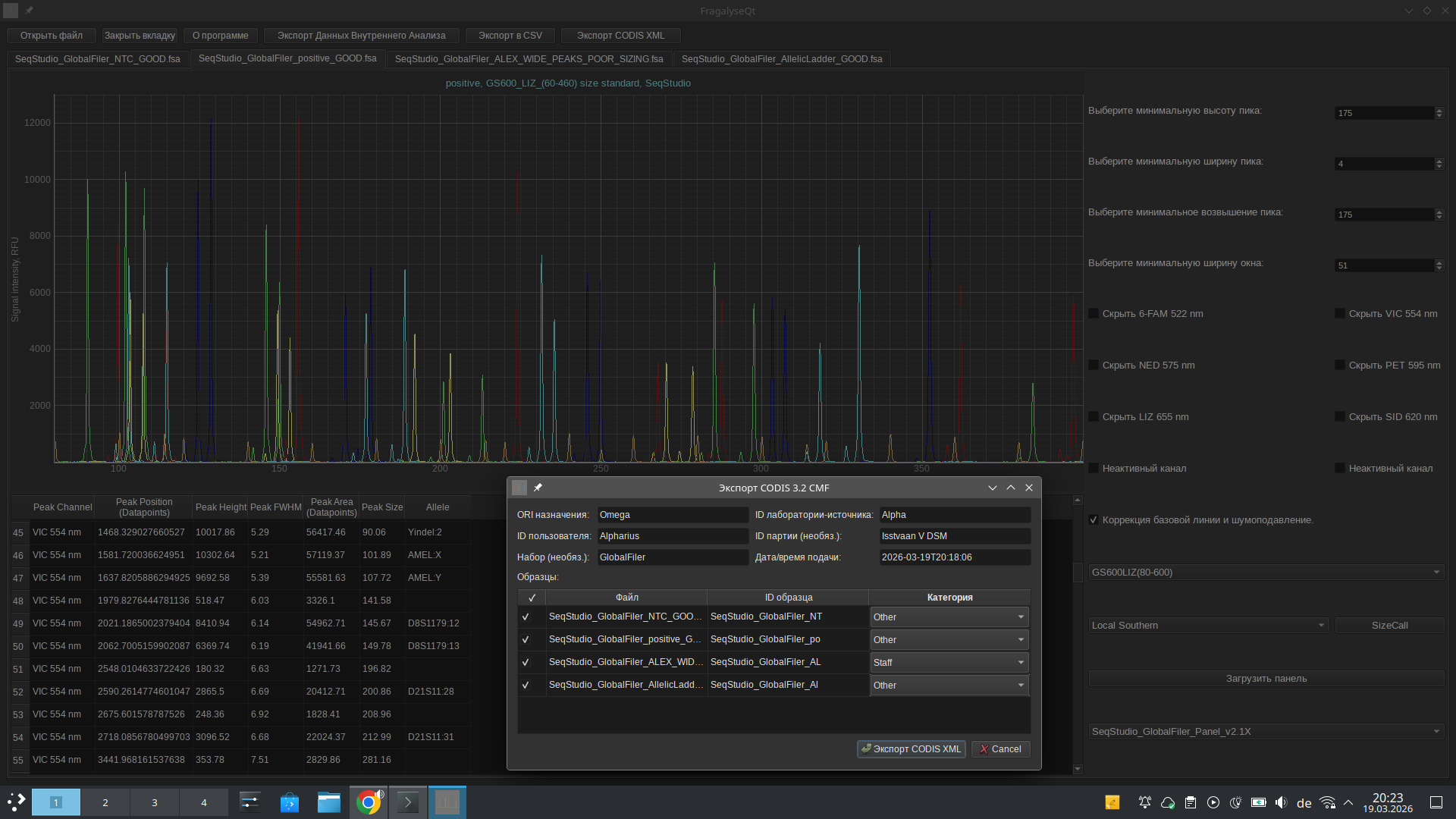 По сравнению с предыдущей версией ( Моя программа для обработки данных фрагментного анализа ДНК ) новая версия стала соответствовать PEP517, получила возможность биннинга пиков сообразно той или иной панели (поддерживает форматы панелей GeneMapper, GeneMarker и NCBI OSIRIS), фильтрацию статтер-пиков (для поддерживающих панелей), может открывать сырые данные с российского прибора для капиллярного электрофореза Нанофор-05 (очень экспериментально, малопригодно для анализа, но работаю в этом направлении), добавлена немецкая локализация, возможен экспорт полученных после биннинга и фильтрации данных в формате CODIS XML (формат полицейских баз данных США и Европы, хорошо описан в спецификациях, опубликованных на сайте ФБР).