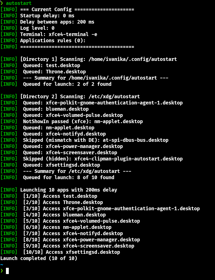 Я тут задался вопросом, а могу ли я запускать приложения в оконном менеджере? И разобравшись в этом, понял, что не все оконные менеджеры умеют работать с автозапуском приложений – имеются в виду .desktop файлы из .config/autostart и /etc/xdg/autostart. Тут я подумал, что у меня нет проектов, которыми я бы гордился, так что решил попробовать написать проект для реализации автозапуска приложений. И спустя 2 или 3 месяца я смог сделать первую стабильную версию. Во-первых, проект ориентирован не на DE, а на оконные менеджеры, которые не умеют автозапускать приложения. Во-вторых, много что ещё работает не так, как надо, и многое не реализовано, как следует. Но оно работает и хотелось бы получить обратный отзыв.