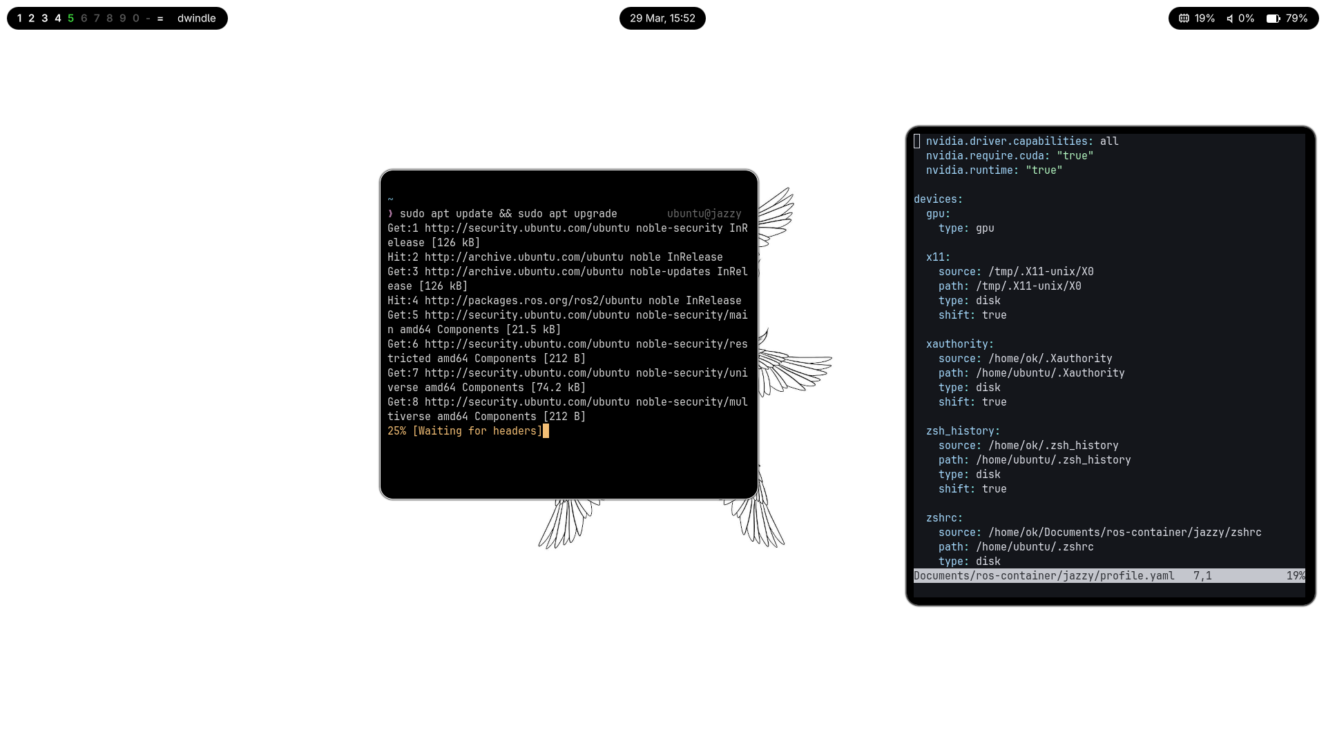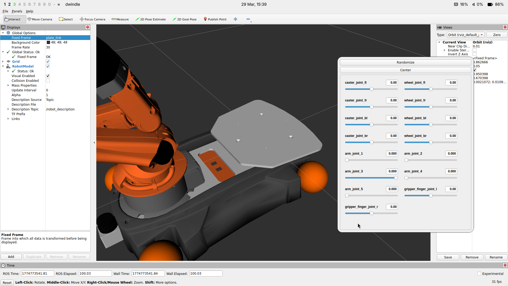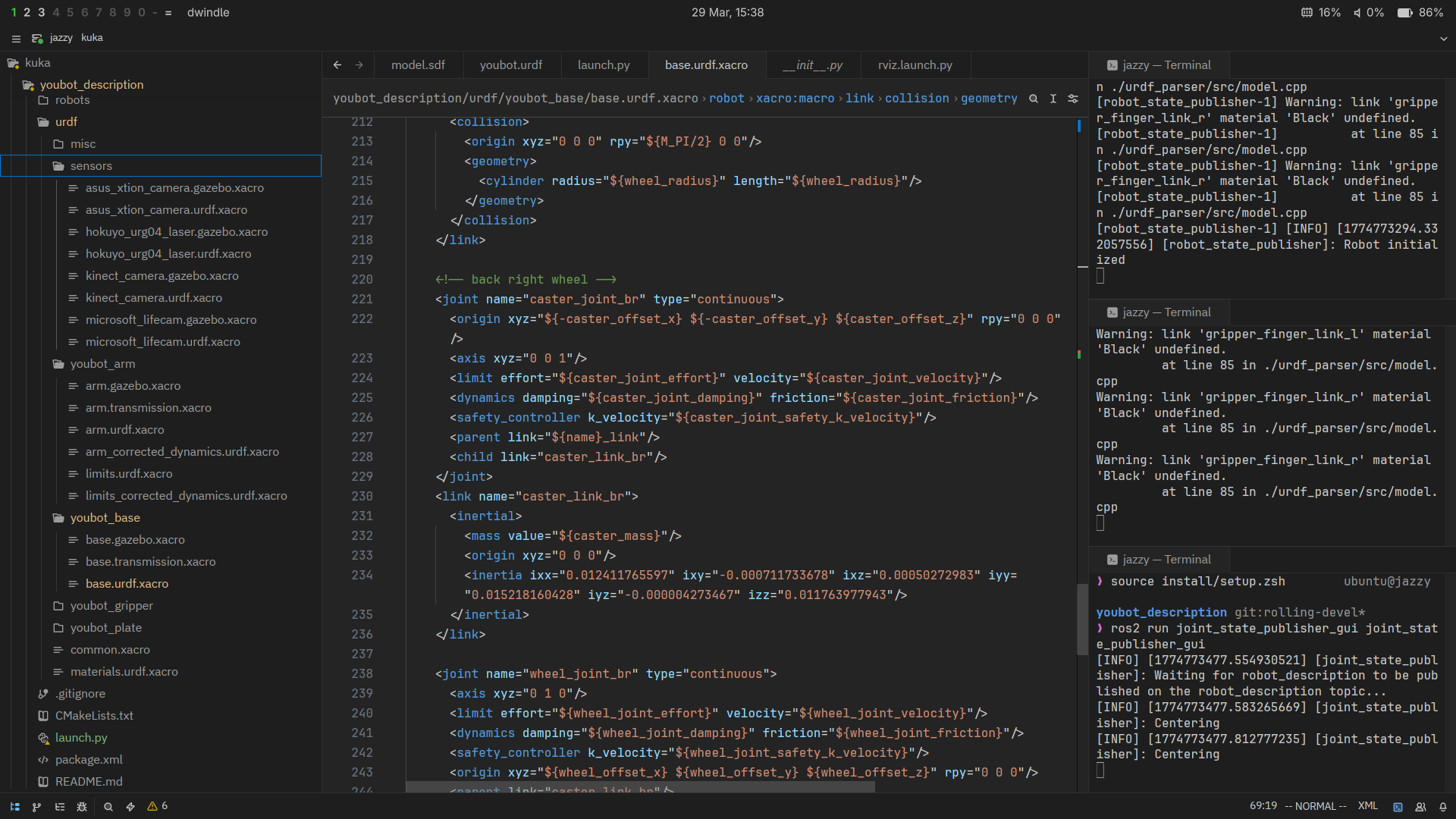На скриншотах alacritty, zed, nvim, incus, ros2, rviz2 и моделька робота kuka youbot.
