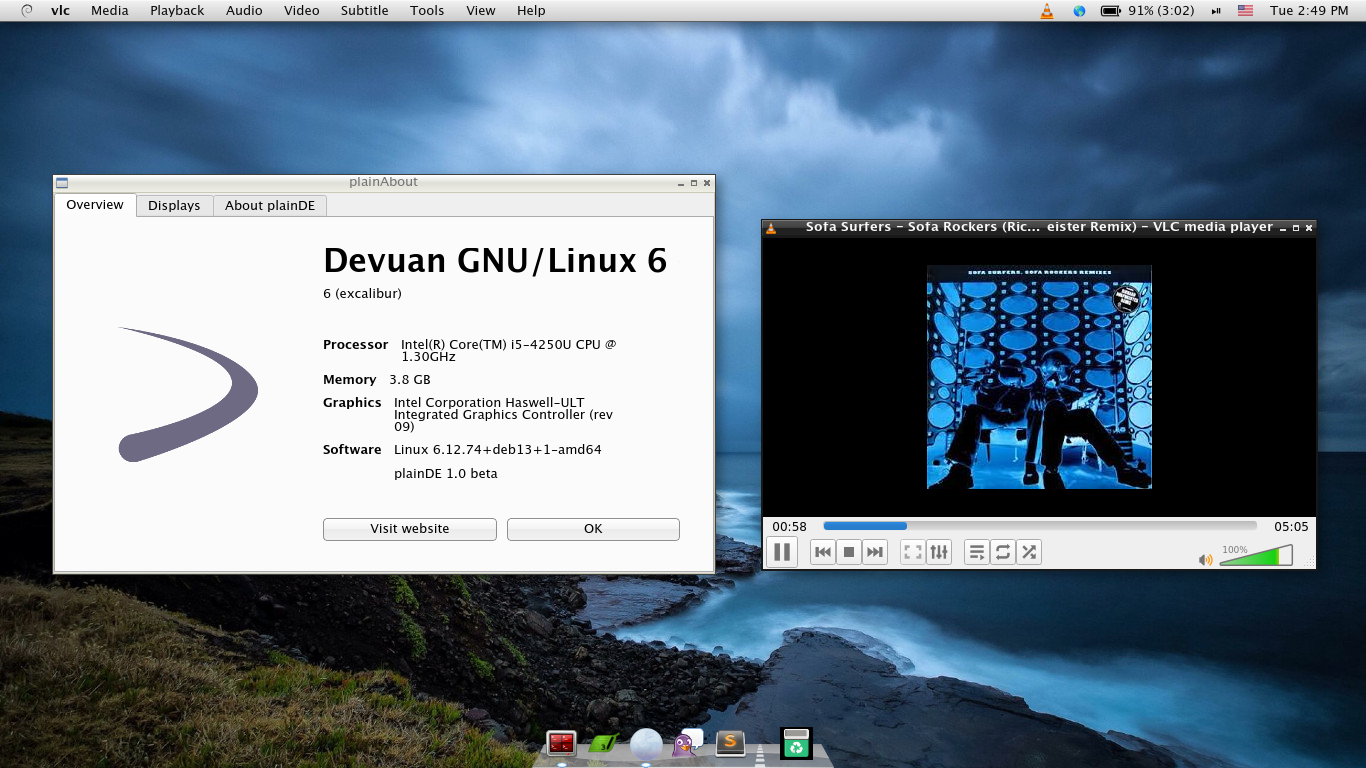 Пускай с прошлого скриншота из виртуалки, не сильно много поменялось, скорее этот пост несет цель напомнить, что не «забил» на развитие проекта, ну и заодно похвастаться апплетом батарейки и чуть более похожим Dock на Mac OS X (изменена текстура, по большей части).