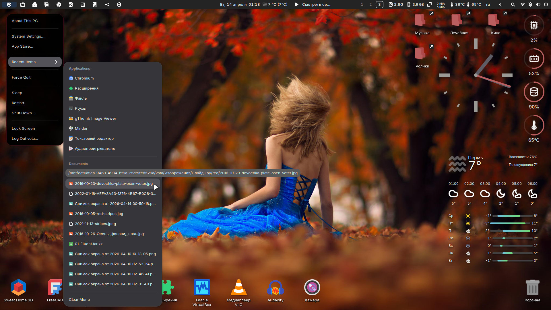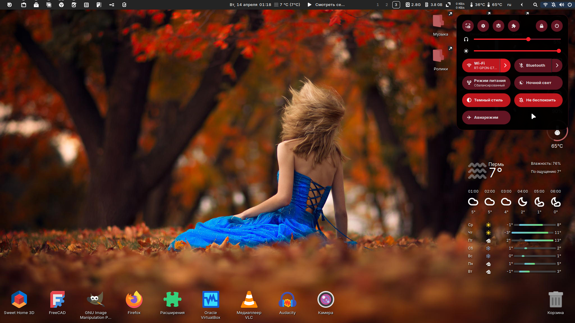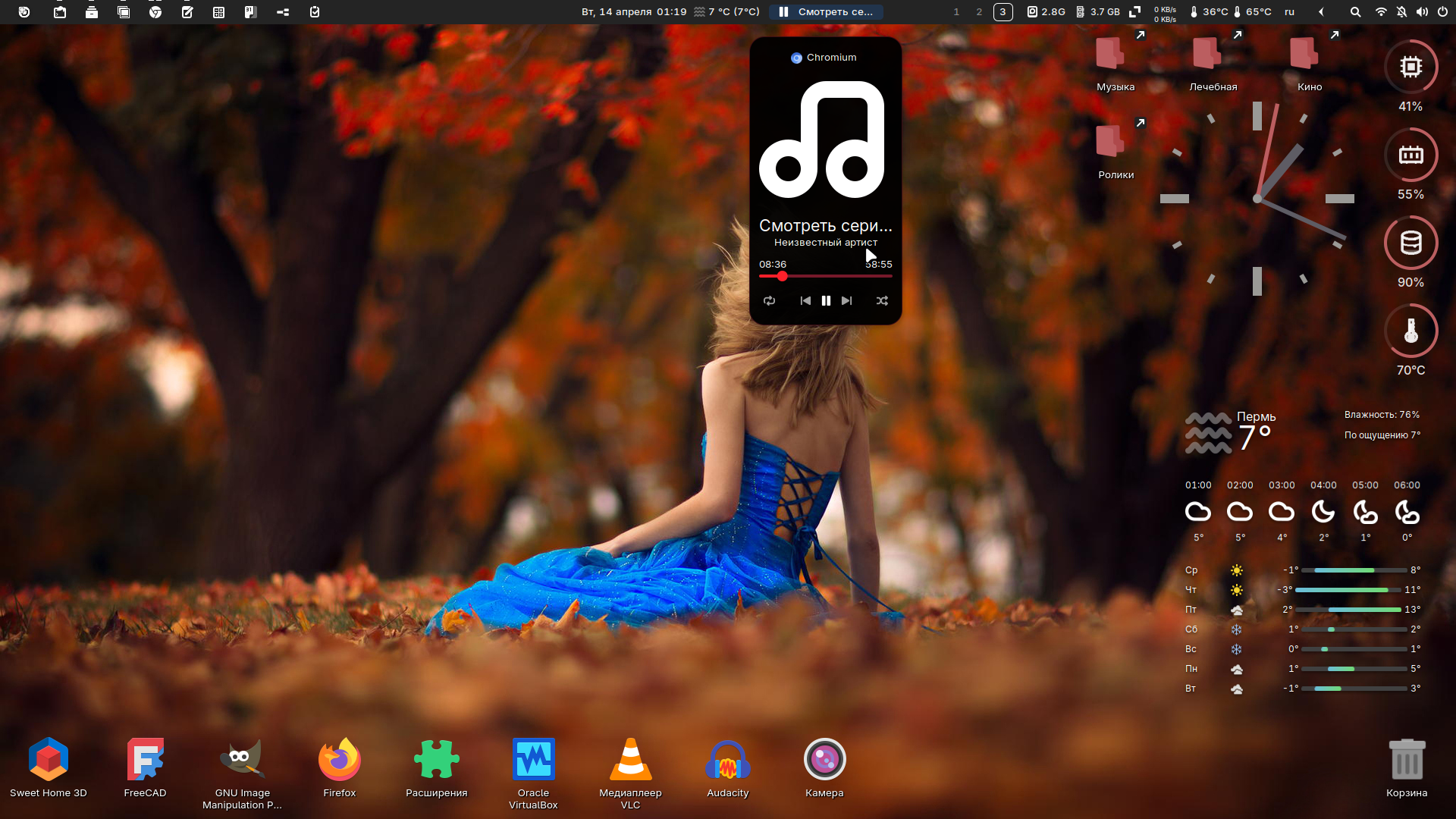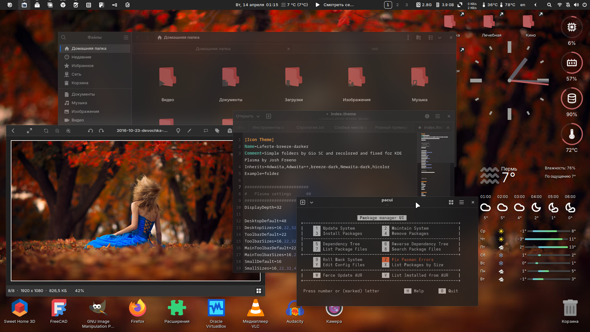 Тема GTK темная, теплая, углы квадратные, обои подходящие — меняются время от времени сами, значки — смесь что надо, панель верхняя — Dash to panel — того же цвета, что и верхняя рамка браузера Chromium — достаточно часто используемого приложения, меню чуть ли не эппловское, компоновка как на любимых всеми WM'ах, удобная, значки прикрепленных приложений в панели — типа значки рабочих столов в этих самых WM'ах, трей разворачивается, сворачивается, нужные показатели показывают температуру, оставшееся место и RAM. Скрыты в трее менеджер буфера обмена, кнопка с настройками всех расширений, и прочие прибамбасы. Погода и прочие виджеты на рабочем столе, скоро может и рабочий стол для документов задействую, как виндусятники делают.
