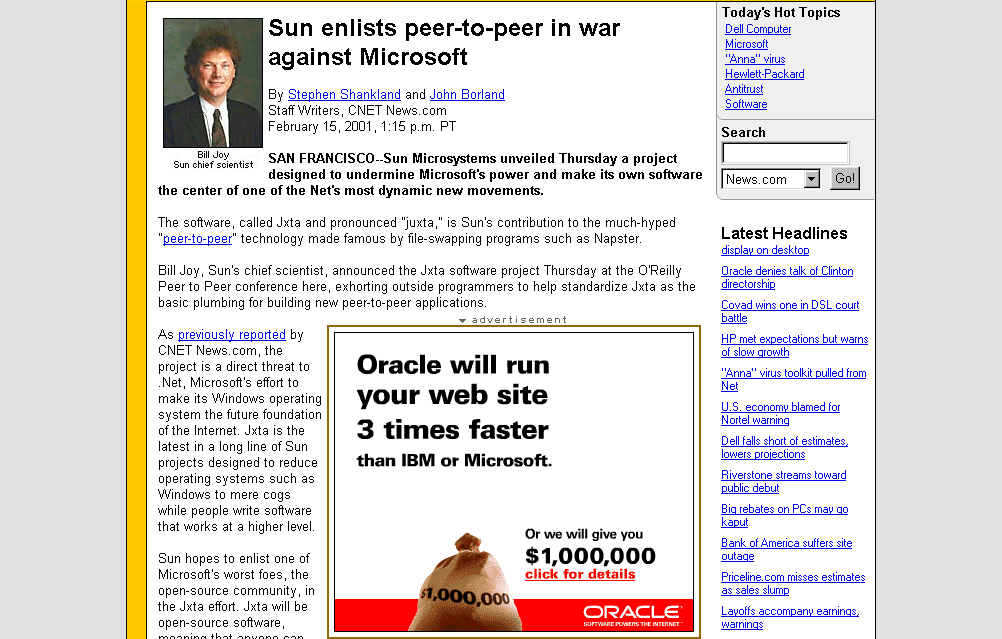 На cnet увидел статейку. Прикольно смотриться с этим баннером от Оракла. Ну просто смешно до слез. И что самое интересное - предложение от Оракла РЕАЛЬНОЕ. По моему SUN Microsystems и Oracle больше всех вы[censored]бываются, но живут с каждым годом все лучше и лучше.