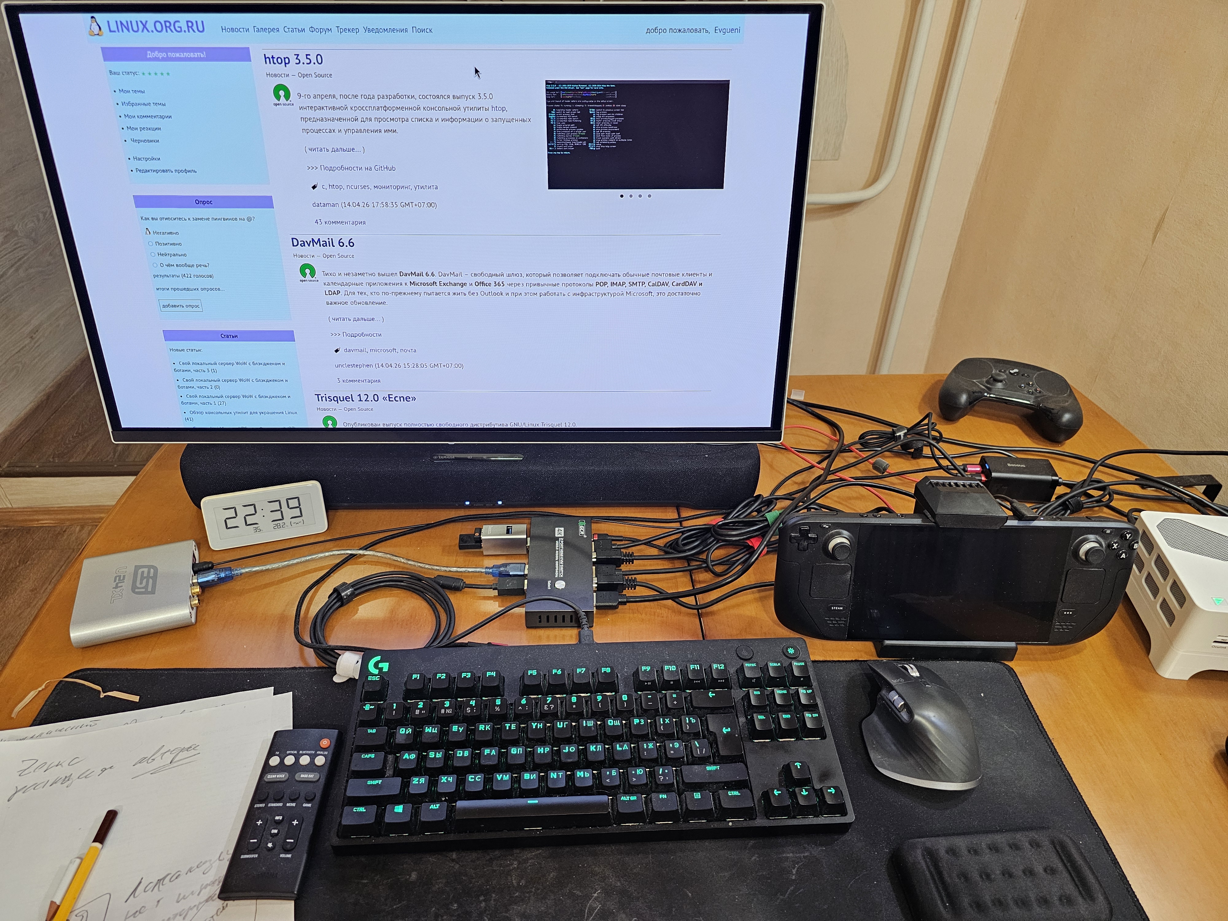 Развитие идеи Steam Deck PC +1 Обновил монитор на Lenovo Legion Pro 27Q-10 (QHD), поменял KVM на версию GCR, чтобы этот монитор поддерживать. Звук пока идёт через ESI U24XL (буквально откопал в залежах всякого). Монитор безусловно яркий, хотя Steam Deck поддерживает его несколько не стабильно (подхватывает при включении через раз). Firebat через 780m работает безупречно.