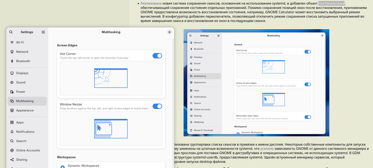 - Файлы (Nautilus): улучшена производительность за счёт более быстрой загрузки миниатюр и снижения потребления памяти. Окна свойств файлов стали всплывающими, а в поиске теперь можно применять несколько фильтров одновременно.