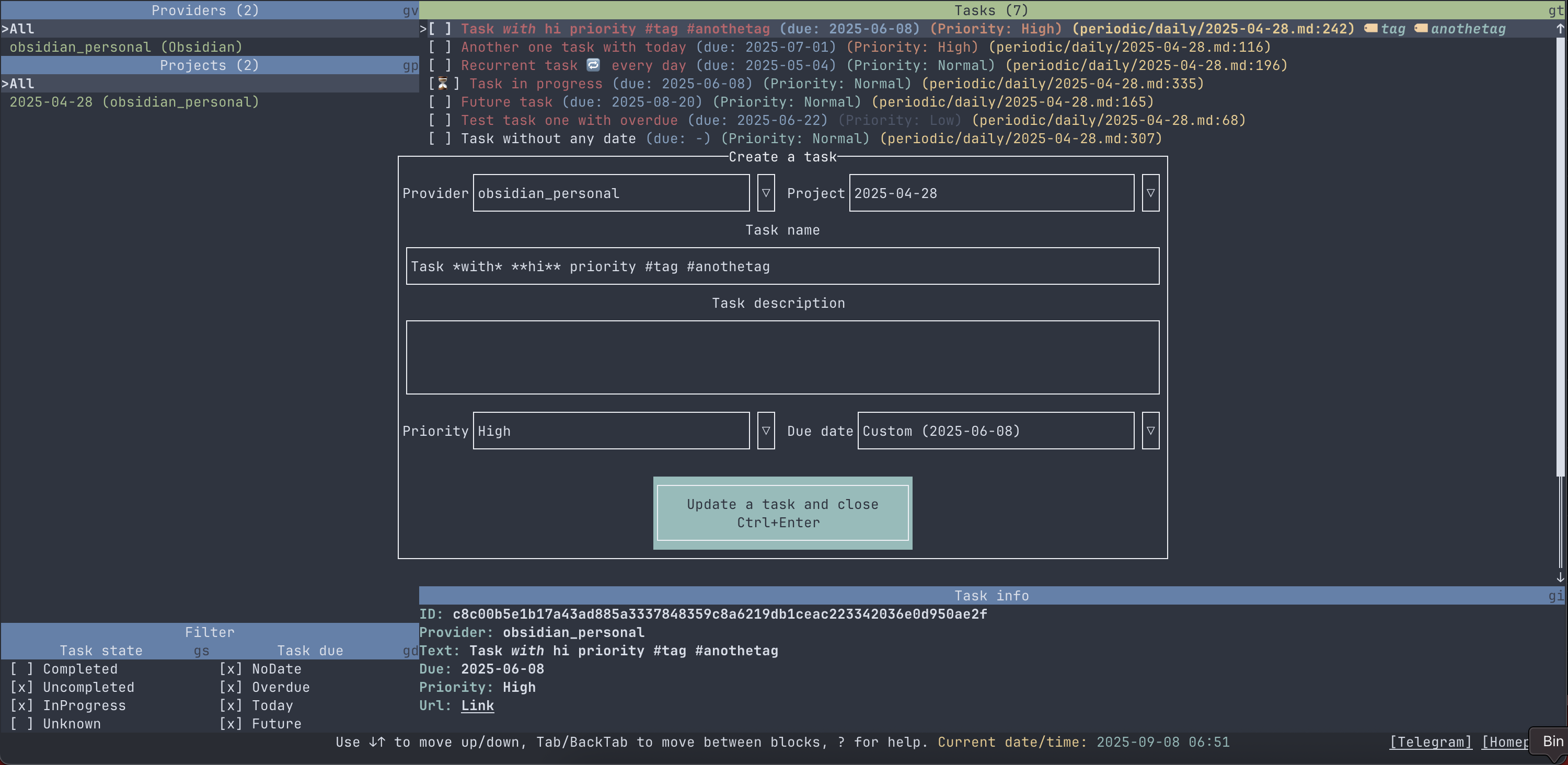 Tatuin реализует TUI для агрегации различных провайдеров задач в одном приложении, позволяющее создавать и редактировать задачи, просматривать их и отмечать как выполненные.