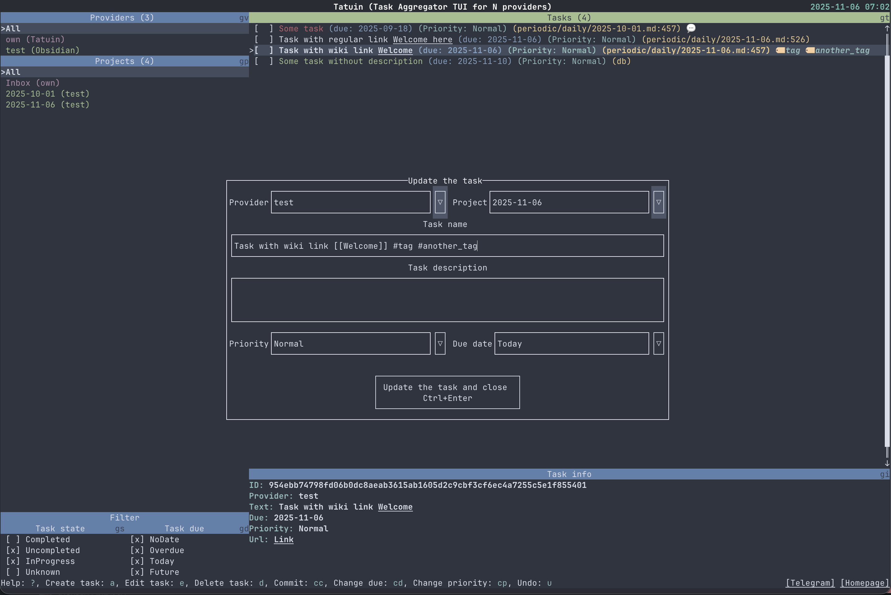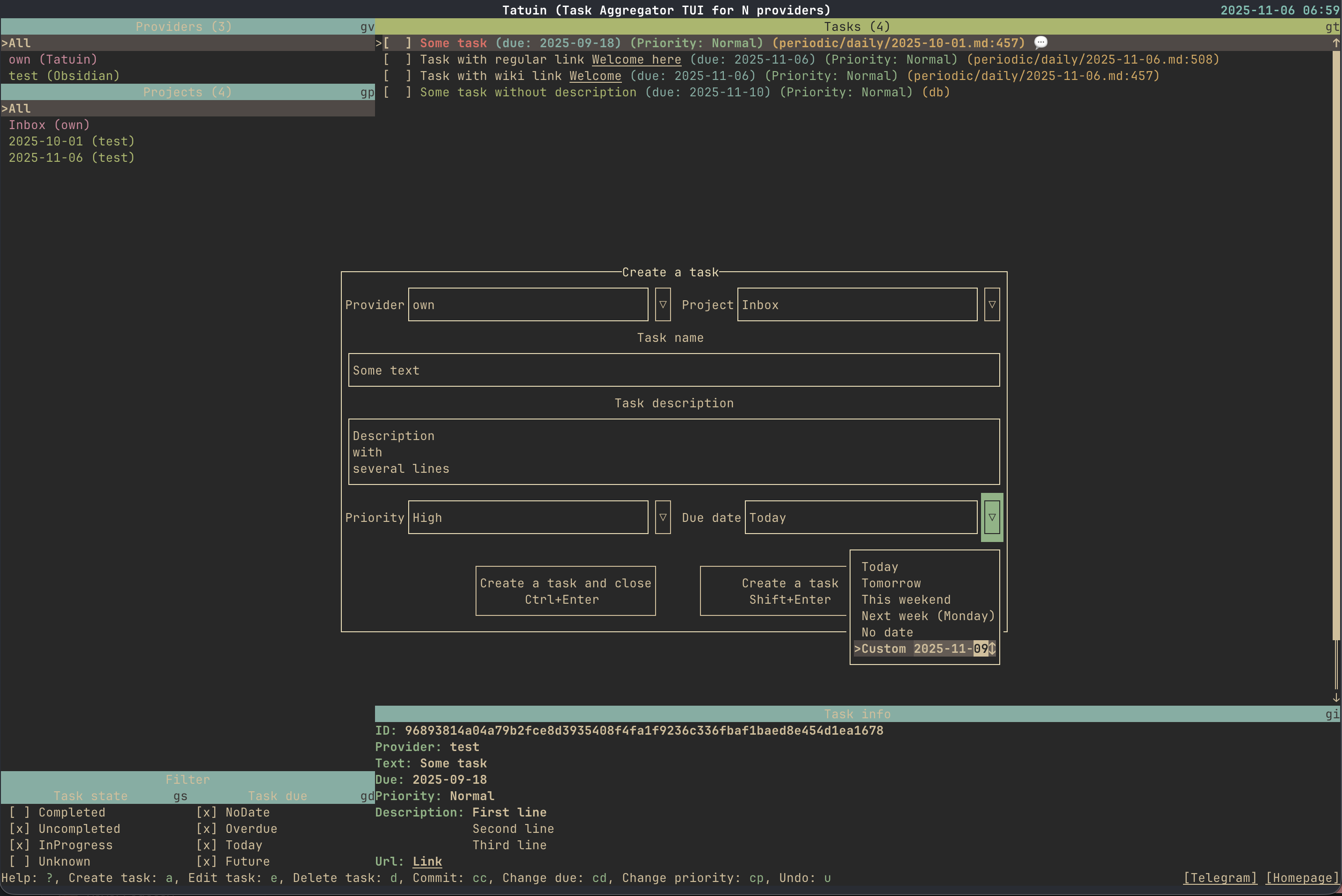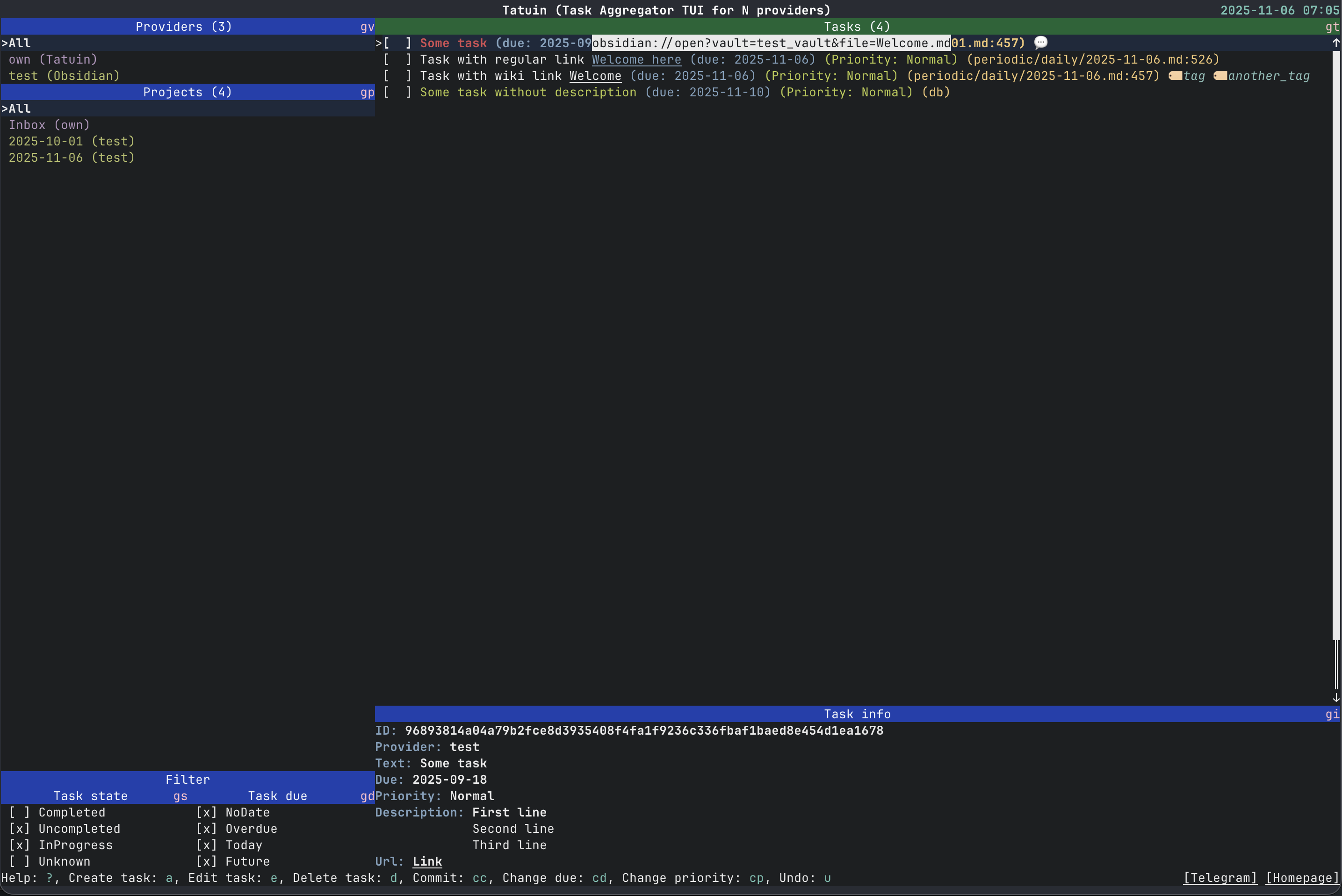 Tatuin (Task Aggregator TUI for N providers) — агрегатор задач с текстовым пользовательским интерфейсом (TUI), объединяющий в одном окне задачи из различных источников: Todoist, Obsidian, GitLab TODO, GitHub Issues, iCal и CalDAV. Поддерживает базовые операции над задачами — добавление, редактирование, выполнение и удаление.