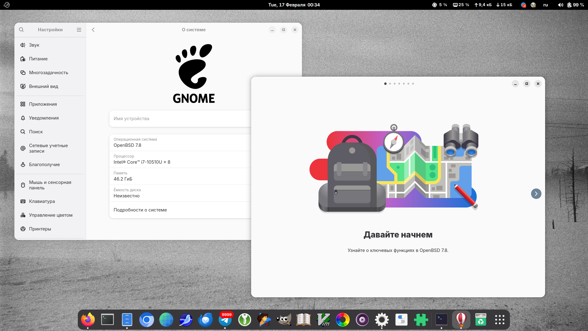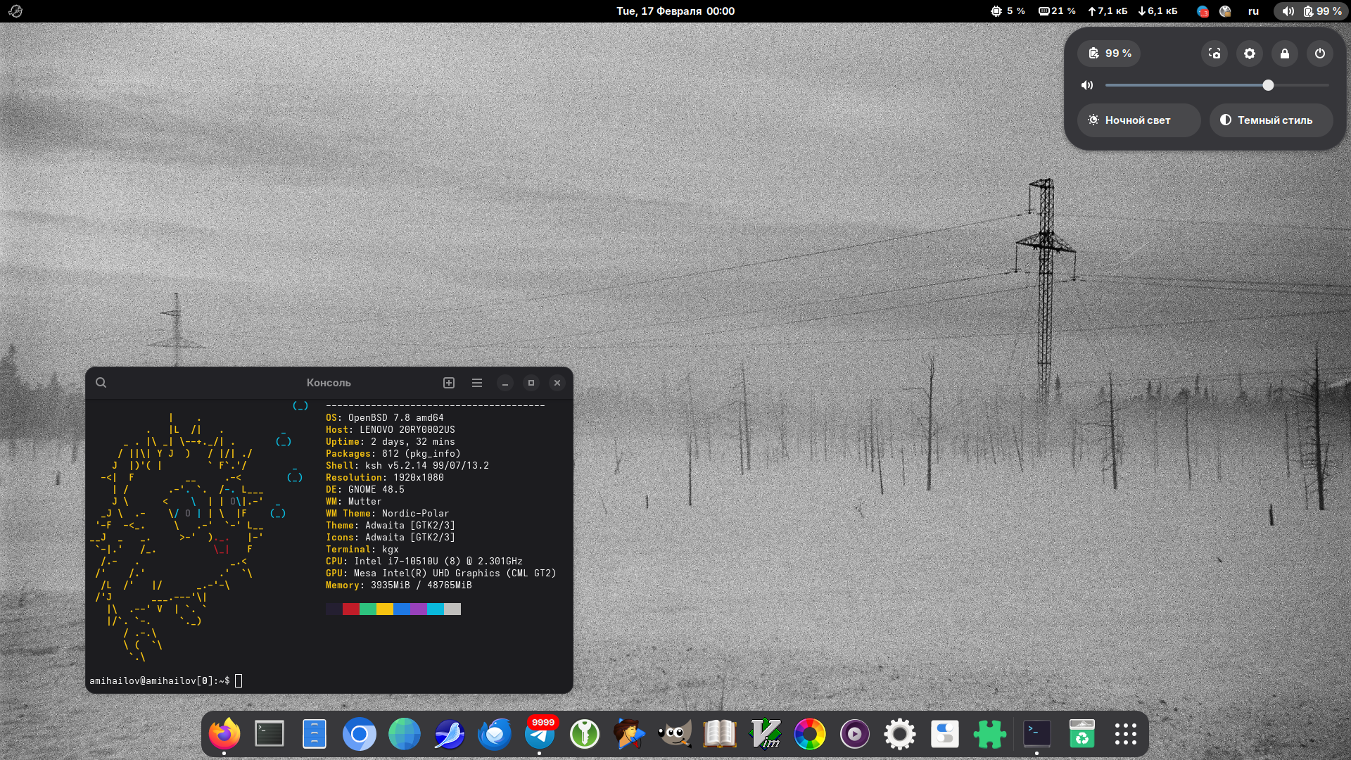 Теперь про скорость работы всего этого дела. Я не играю в игры, не гоняю вайн и все остальное, в основном у меня главный потребитель ресурсов – это браузер (и сбоку терминал). Firefox работает достаточно сносно, открыть 15-20 вкладок – вполне. Конечно, нет никакого аппаратного ускорения, некоторые тяжелые сайты нагружают CPU и открываются долго. Например vk. Youtube тоже будет работать не быстро. Jira будет работать сносно, если нет параллельно чего-то тяжелого. Видеоконференции с видео с веб-камерами (зум и прочее) – будут тормозить сильно, но часто это можно отключить, смотреть/показывать шеринг экрана – можно. Как ни странно – в большинстве случаев этого всего хватает.