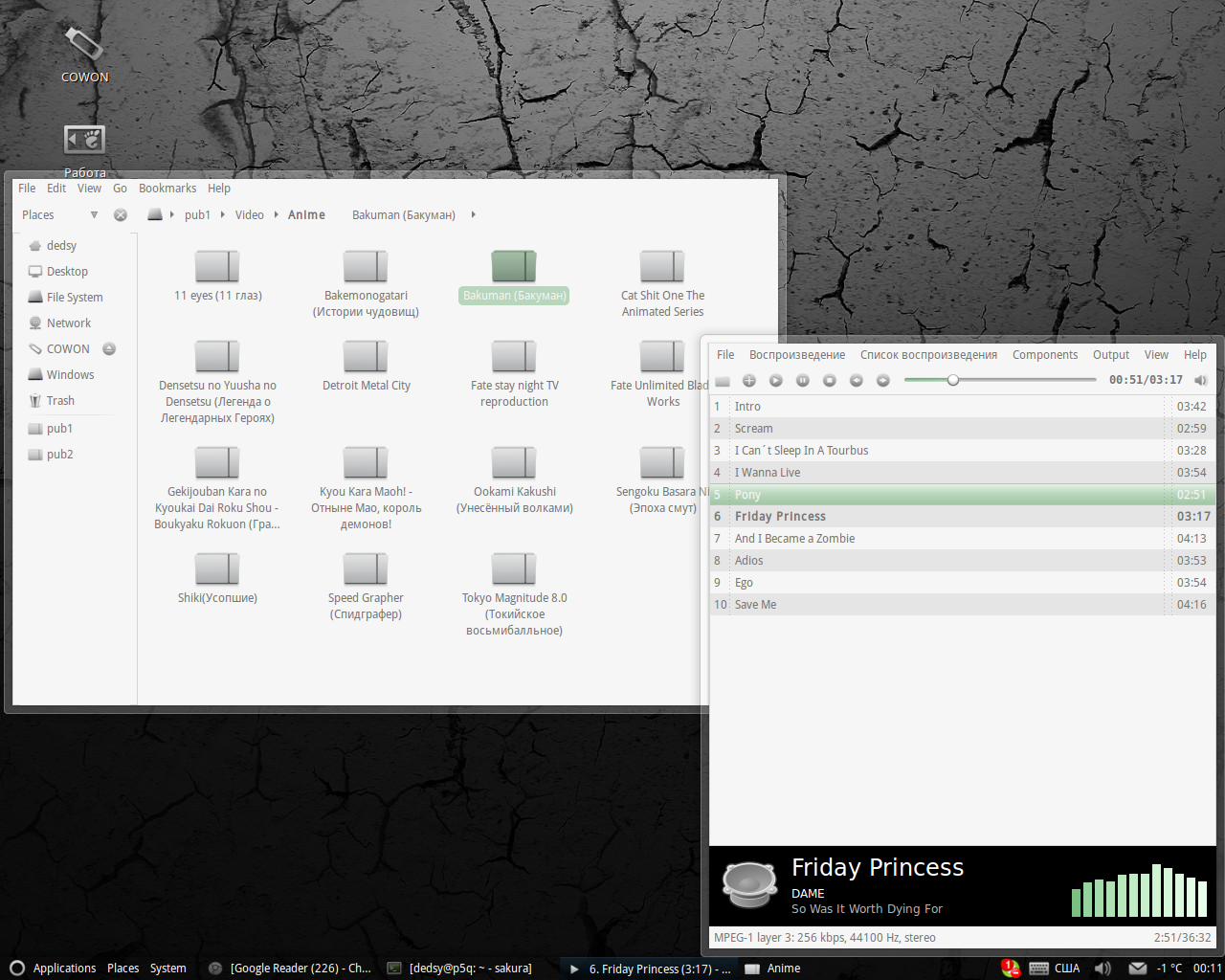 :) Тема Equinox Light, Ш - Ubuntu + Droid Sans Mono , Icons - awOken, anime - BECK Mongolian Chop Squad... Вобщем-то на домашнем ПК выполняется не много задач - скачка с интернетов всякого стафа, просмотр и конвертирование видео, слушаем музыку да, игра в Heroes of Newereth и удалённая работа ( через RDP на рабочей машинке сижу .. да да, там Windows XP ибо Foxpro и Linux не совместимы.. :( )