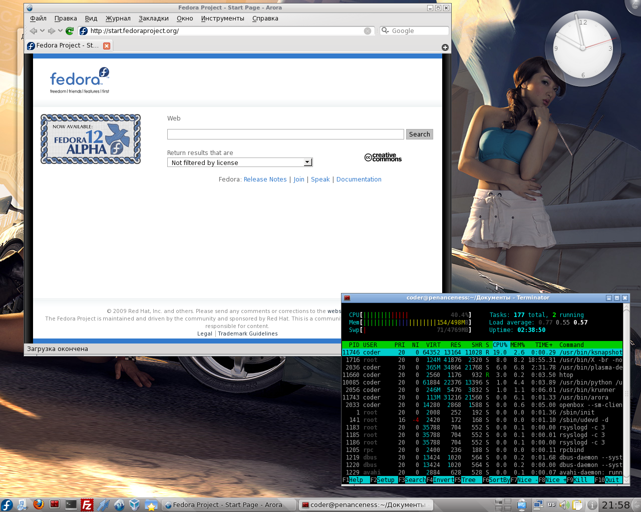 Вот мой рабочий стол на Арче. Стоит Gnome 3 в альтернативном режиме(шел не по душе), тема Drakfire-Caffe, иконки Faenza. Ядро 3.0.3 заменил на LTS 2.6.32, скорость работы слегка выросла. Также стоит Firefox 6, рекламу режет не AdBlock, а Privoxy с конвертироваными под него списками Адблока. Audacious играет какое-то немецкое радио.Скорость работы больше чем на XP - рекорд использования ОСью оперативки 113 мб. Комп: AMD Athlon 1.6 мгц, ОЗУ 768 mb, ATI Radeon 9250 64mb.
