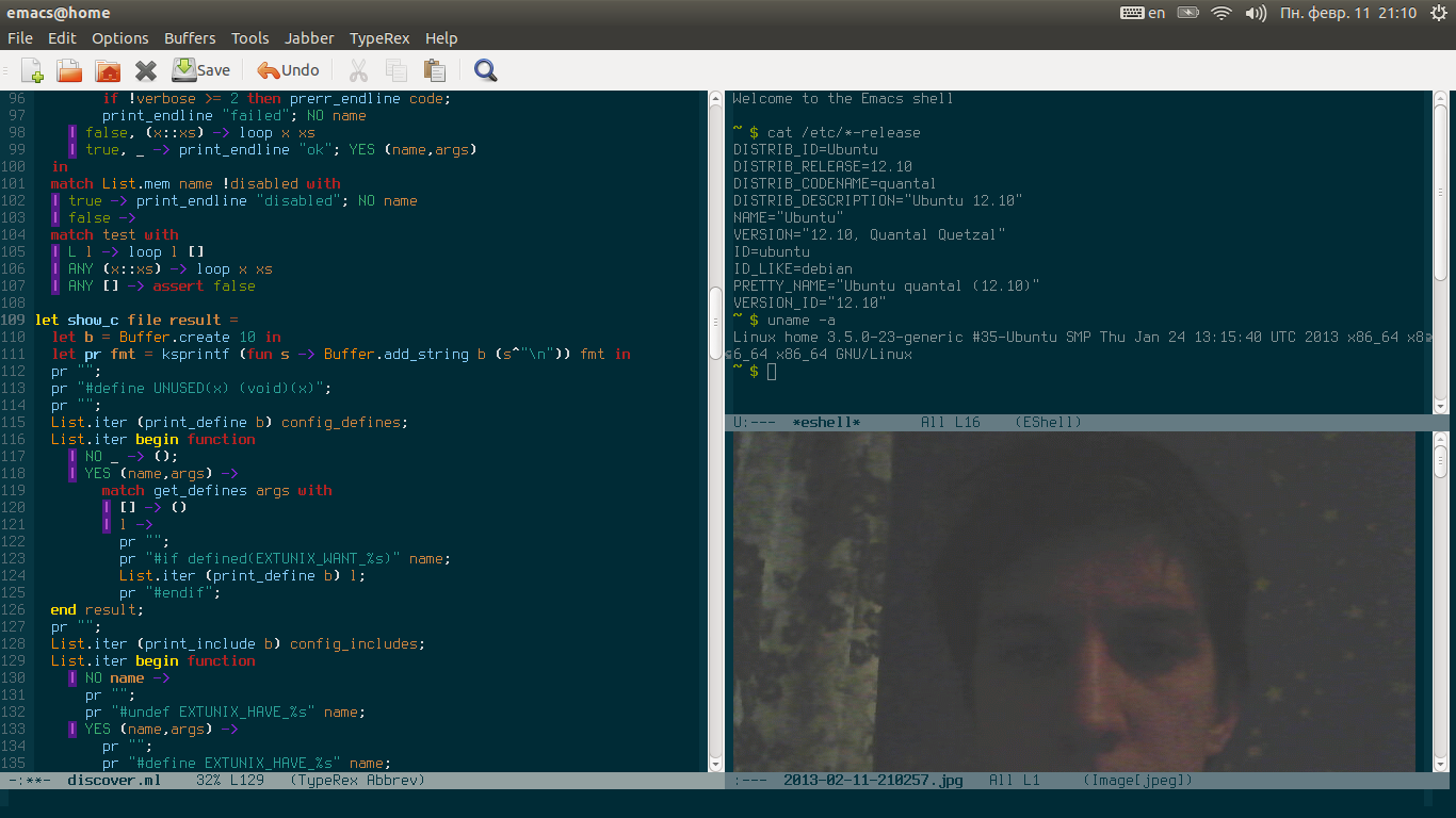 Ну а так всё уныло: Ubuntu 15.04, GNOME 3.14, Emacs 24.4 (на скриншоте запущен в URxvt), тема везде Paper, кроме иконок, которые Numix Circle.